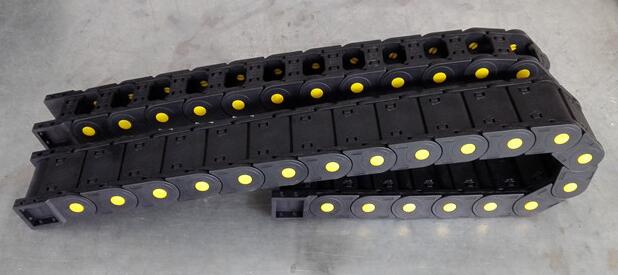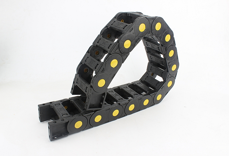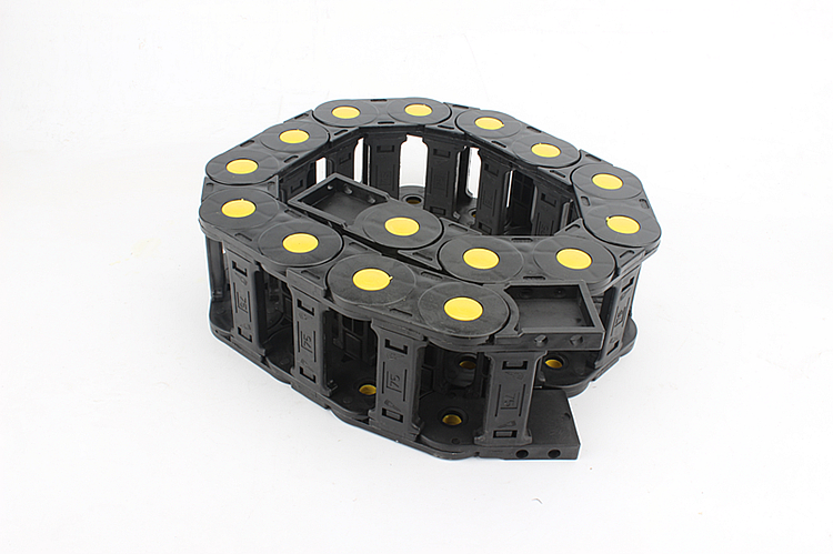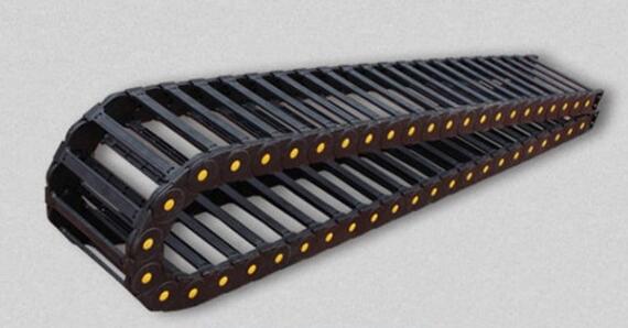 電纜拖鏈外形似坦克鏈,由眾多的單元鏈節組成,拖鏈每節都能打開,裝拆方便,不必穿線,打開蓋板后即可把電纜、油管、氣管、水管等放入拖鏈。另外可提供分隔片,將拖鏈內部空間按需要分隔開。