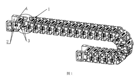 目前的拖鏈都是由若干依次連接的鏈節,所述鏈節包括呈相同設置的左、右側板以及呈相同設置的上、下蓋板,上、下蓋板均兩端分別固定連接左、右側板并扣合圍成用于線纜穿過的線腔。由于通常采用固定連接的方式來連接左右側板和上下蓋板,所以在鏈節擺動或者轉動的時候,都是依靠相互連接的鏈節之間的塑性變形來完成的,拖鏈擺動的范圍比較有限,可周轉的范圍很小,不適合較小角度的放置并布置線纜,再者是直接采用過盈配合或者鉚接等方式連接的,連接結構比較簡單,過盈鉚接容易因為長期的扭轉擺動使用而脫離連接,再者拆裝的時候也非常不方便。