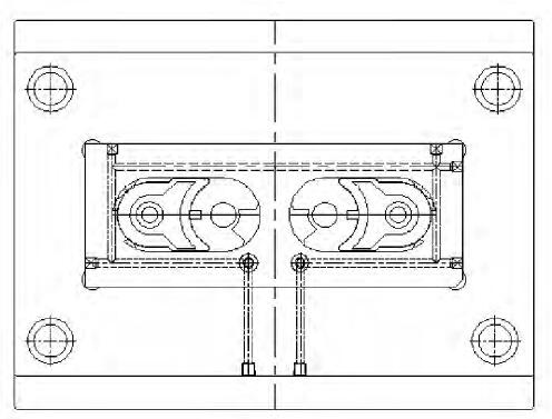 該塑件需要批量生產(chǎn),且要求表面光滑及外形美觀,因此模具設(shè)計了冷卻系統(tǒng)。根據(jù)模具的結(jié)構(gòu),在定模和動模中分別設(shè)置了冷卻水路,如圖6所示。冷卻水管均勻分布在型芯板和型腔板上,水路所用水管是直徑為6.0mm 的圓形銅質(zhì)水管。
