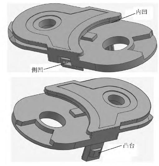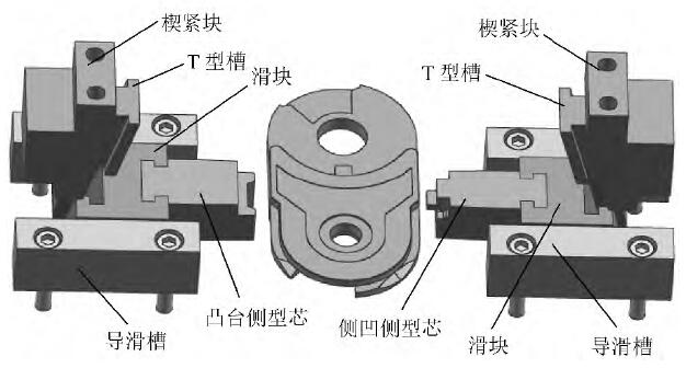 抽芯機(jī)構(gòu)的設(shè)計為了使注塑工件順利脫模需設(shè)計抽芯機(jī)構(gòu),抽芯機(jī)構(gòu)由楔緊塊、滑塊、側(cè)型芯、導(dǎo)滑槽和限位螺釘?shù)冉M成,如圖3 所示。凸臺和側(cè)凹的抽芯設(shè)計為動模抽芯,其抽芯力及抽芯距均很小; 楔緊塊采用螺釘固定在定模板上,與滑塊采用T 型槽連接,開模后楔緊塊和滑塊相對運(yùn)動促使滑塊帶動側(cè)型芯沿著導(dǎo)滑槽移動,實現(xiàn)了凸臺側(cè)型芯和側(cè)凹側(cè)型芯與塑件的脫離。