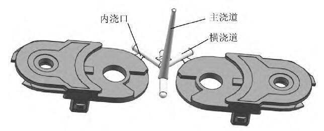 塑料拖鏈板要求表面光滑、外形美觀,因此模具選用側(cè)澆口。為了保證充填完整選用扇形澆口,該類澆口進(jìn)料口寬闊,可保證進(jìn)料通暢,同時也可降低制品的內(nèi)應(yīng)力,減少成品變形。澆口位置的選擇如圖2 所示。澆注系統(tǒng)由主澆道、橫澆道、內(nèi)澆口和拉料桿等組成。主澆道入口直徑為3.5mm,脫模斜度為1° ; 橫澆道截面形狀為圓形,直徑為 6.0mm; 扇形澆口入口尺寸寬度為3.0mm,厚度為0.8mm,斜度為40°; 拉料桿的設(shè)置是為了保證澆注系統(tǒng)的凝料順利脫模,直徑為 6.0mm。