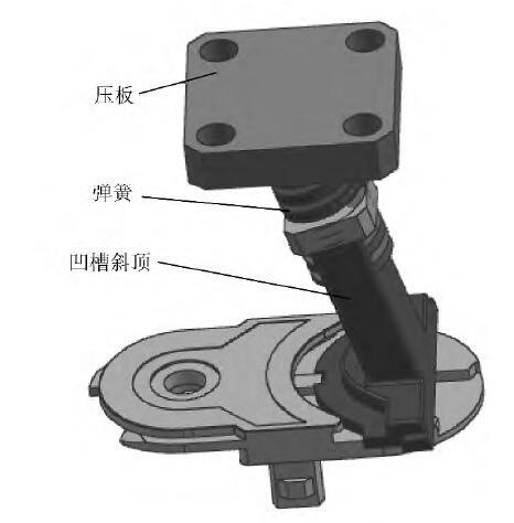 為使塑件的內(nèi)凹在開模時順利脫模,設(shè)計了定模抽芯機(jī)構(gòu),該機(jī)構(gòu)由壓板、彈簧和凹槽斜頂?shù)冉M成,如圖4 所示。開模時,一直處于壓縮狀態(tài)的彈簧松開,產(chǎn)生的彈力使得凹槽斜頂向外側(cè)運(yùn)動,直到凹槽斜頂和工件脫離,實現(xiàn)定模凹槽斜頂?shù)拿撃!?br />