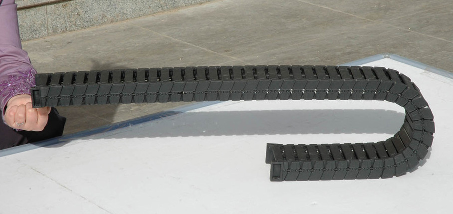 塑料拖鏈能夠對內置的電纜、油管、氣管、水管等起到牽引和保護作用。拖鏈每節都能打開,便于安裝和維修。運動時噪音低、耐磨、可高速運動。拖鏈已被廣泛應用于數控機床、電子設備、石材機械、玻璃機械、門窗機械、注塑機、機械手、起重運輸設備、自動化倉庫等。塑料拖鏈增強機械設備的整體藝術造型效果。